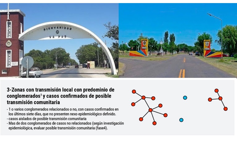 Asimismo, aparecen como zonas con casos esporádicos o transmisión local por conglomerados/brotes controlados las localidades de: Viale y San Benito (departamento Paraná), Libertador San Martín (departamento Diamante), San José (departamento Colón), Colonia Avellaneda (departamento Paraná), Larroque (departamento Gualeguaychú), General Ramírez (departamento Diamante), Ibicuy (departamento Islas del Ibicuy), Oro Verde (departamento Paraná), Villa del Rosario (departamento Federación), Hernandarias (departamento Paraná), Lucas González (departamento Nogoyá), Seguí (departamento Paraná), Pueblo General Belgrano (departamento Gualeguaychú).