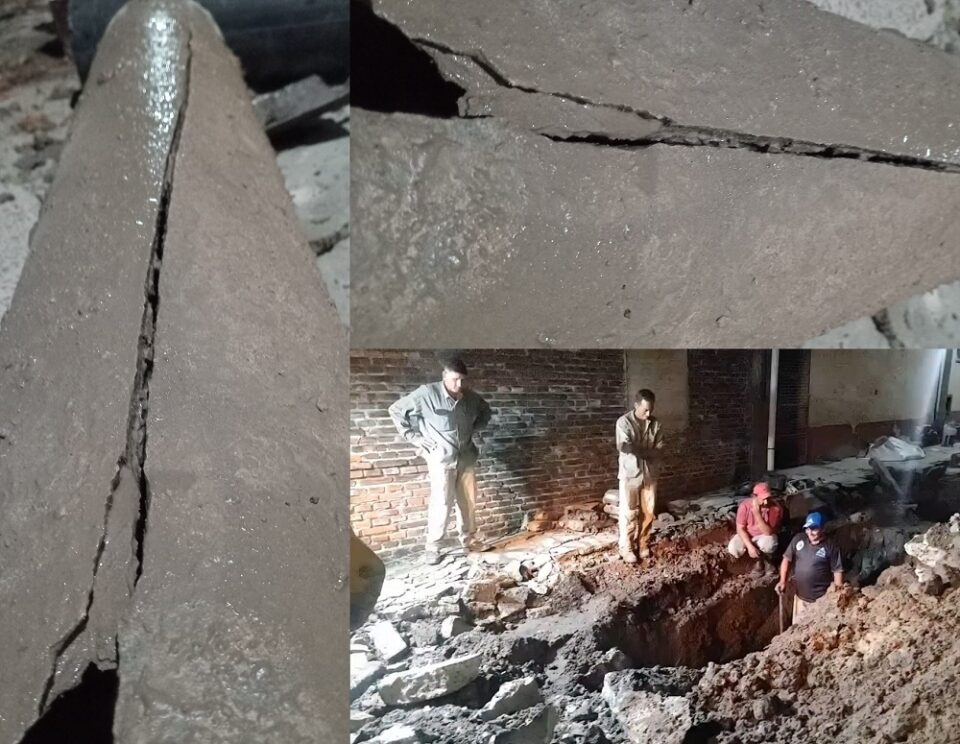 Localizaron la rotura del caño, tiene una rajadura de 4 metros, ya fue extraído y trabajan en el reemplazo