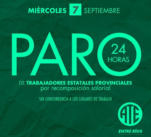 “Hasta tanto no tengamos respuestas favorables en virtud de las demandas planteadas en la última reunión paritaria, lo resuelto por Plenario de Secretarios Generales Provincial de nuestra entidad gremial es convocar medidas de fuerza en sus distintas modalidades, paro sin concurrencia, paro activo, asambleas, retención de servicios, movilización para el día miércoles 7 de septiembre del corriente, desde las 0:00 a las 24:00 hs, en todo el territorio de la provincia de Entre Ríos, garantizando las guardias mínimas en los servicios esenciales de la misma”, se lee en la notificación enviada al titular de la cartera laboral, Ángel Zacarías.